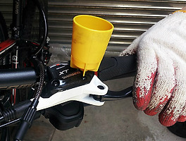 18.브레이크를 서너차례 잡았다 놓았다를 반복한다. 새 로터에 맞게 압력과 피스톤이 자리를 잡도록 하는 과정이다. 그 다음 브레이크 레버를 꽉 잡은 다음 그 상태를 유지한다. 이 때 약간 덜 조여줬던 캘리퍼가 자리를 잡게 된다. 피스톤이 패드를 밀고 패드는 새 로터 양쪽을 단단히 물게 된다.